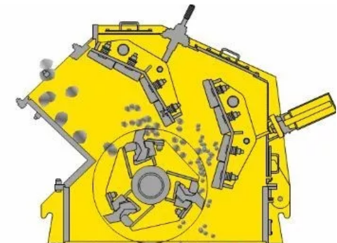 在處理物料含水量過大時,反擊式破碎機的進料溜槽和反擊板可配備加熱裝置,防止物料的粘結。反擊式破碎機不須配備底部篩板可有效防止堵塞現象。